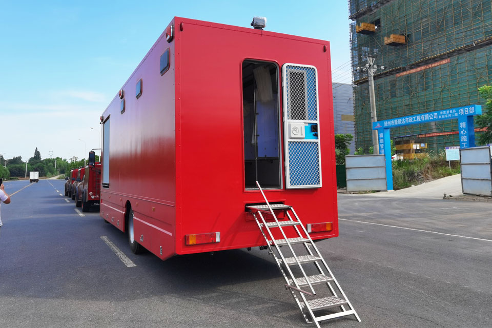 1、整車擴(kuò)展艙為更衣間,更衣間右外側(cè)設(shè)有門和門梯,撤收后門梯固定在主車廂下副梁中間,更衣間門口處設(shè)有門梯燈;廂體后端設(shè)有登頂梯,主車廂下設(shè)有擴(kuò)展機(jī)構(gòu),擴(kuò)展艙(更衣間)的展開和撤收由擴(kuò)展機(jī)構(gòu)實(shí)現(xiàn),撤收后有可靠的鎖緊機(jī)構(gòu)。設(shè)備間在廂體前端:內(nèi)部有燃油熱水鍋爐、2.8KVA柴油發(fā)電機(jī)、水泵、精密過濾器、暖風(fēng)機(jī)、滅火器、通風(fēng)窗、照明燈;淋浴間設(shè)置12個(gè)淋浴噴頭、U形不銹鋼水箱(淋浴間前端、右端、后端設(shè)置水箱)、皂盒、通風(fēng)窗、照明燈;更衣間為右側(cè)擴(kuò)展艙,內(nèi)設(shè)有更衣柜、衣帽鉤、照明燈、前端下部設(shè)有通風(fēng)進(jìn)氣門、后端上部設(shè)有換氣扇。